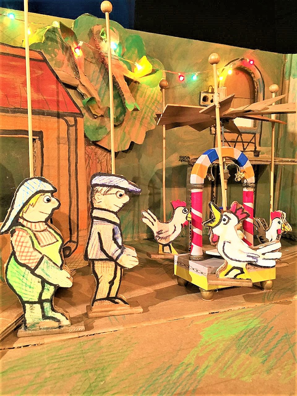 Die Inszenierung spielt in einem riesigen Auto aus Pappe mit vielen Paketen mit Bühnenbildnern aus Pappe und Puppen aus Pappe. Also ein Pappentheater.