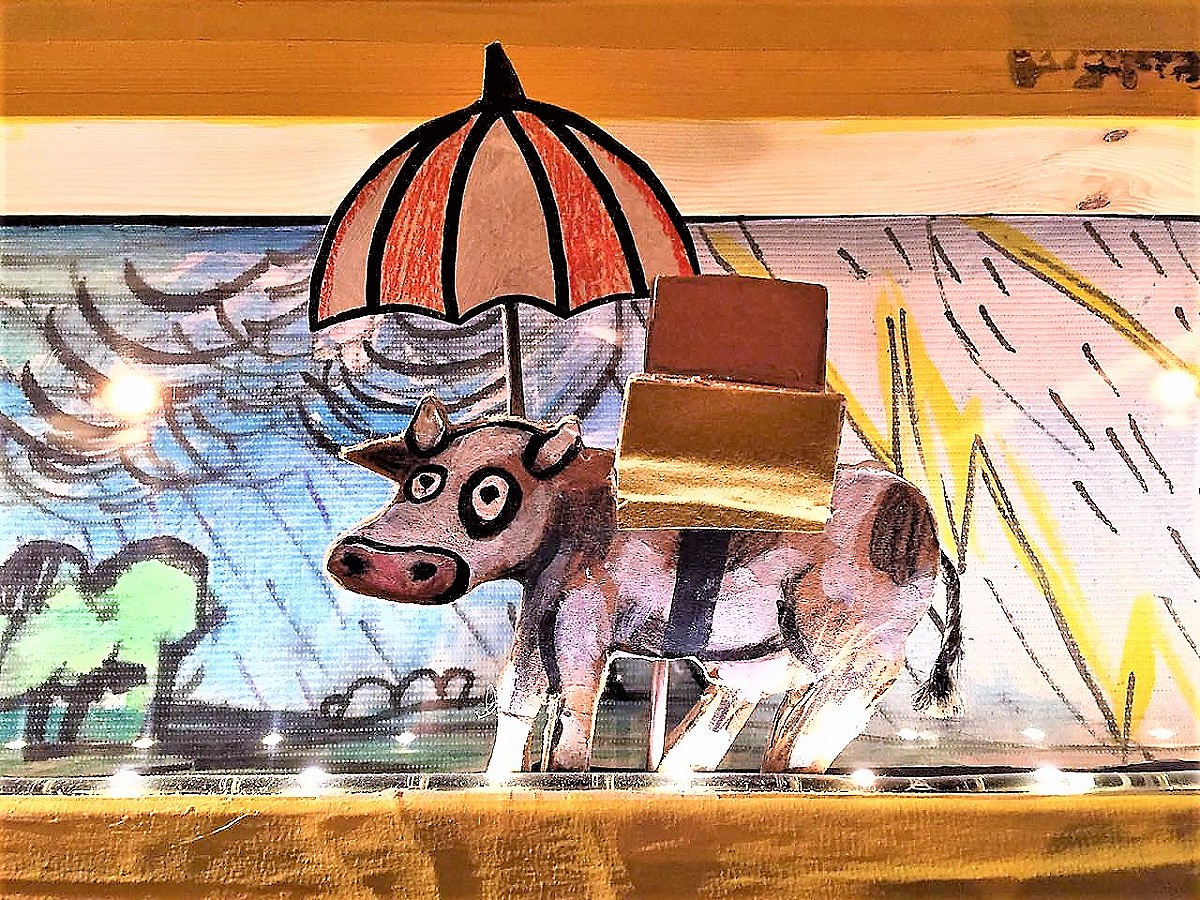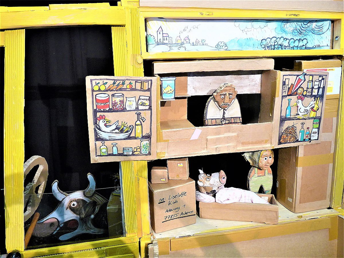 Ein rührend komisches Puppentheater gespielt in einem großen Postauto aus Pappe für Kinder ab 4 Jahren, frei nach dem Kinderbuch Kuh Liselotte